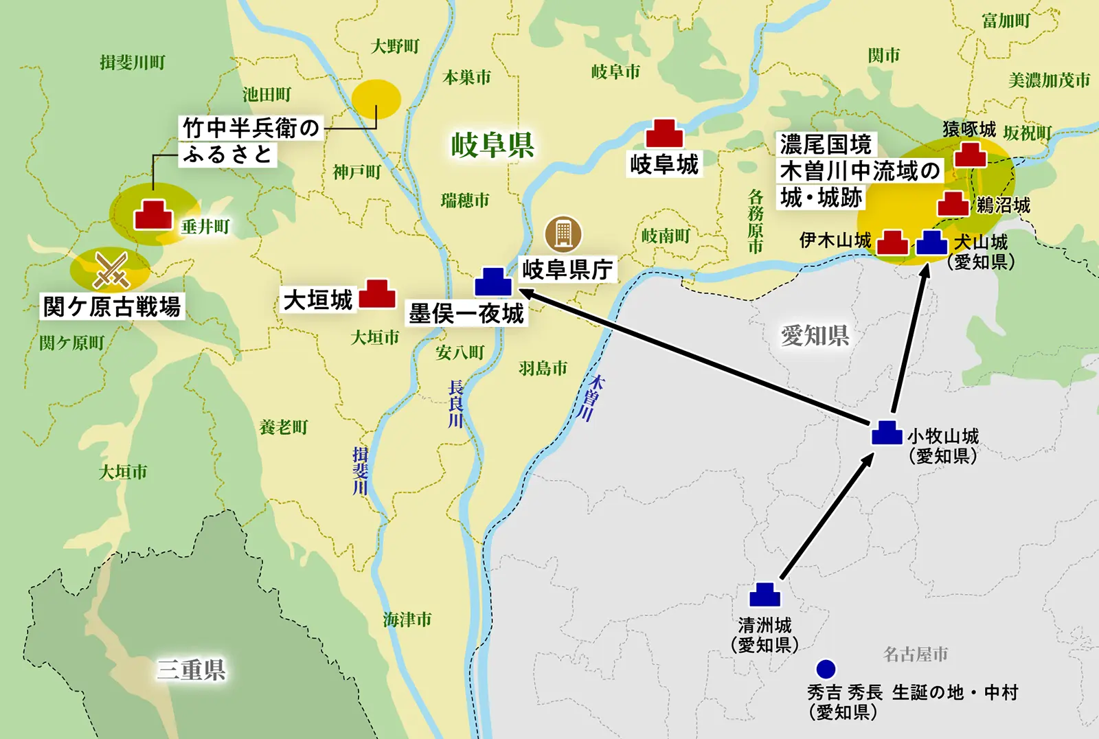 信長が斎藤龍興から奪取した金華山にそびえる岐阜の名城です。稲葉山城を手に入れ美濃攻略を果たした信長は天下布武を掲げました。また、信長の稲葉山城攻略から遡ること3年前、秀吉の軍師として後に活躍する竹中半兵衛が、少数の兵で稲葉山城を一時的に占拠するという大事件を起こしています。